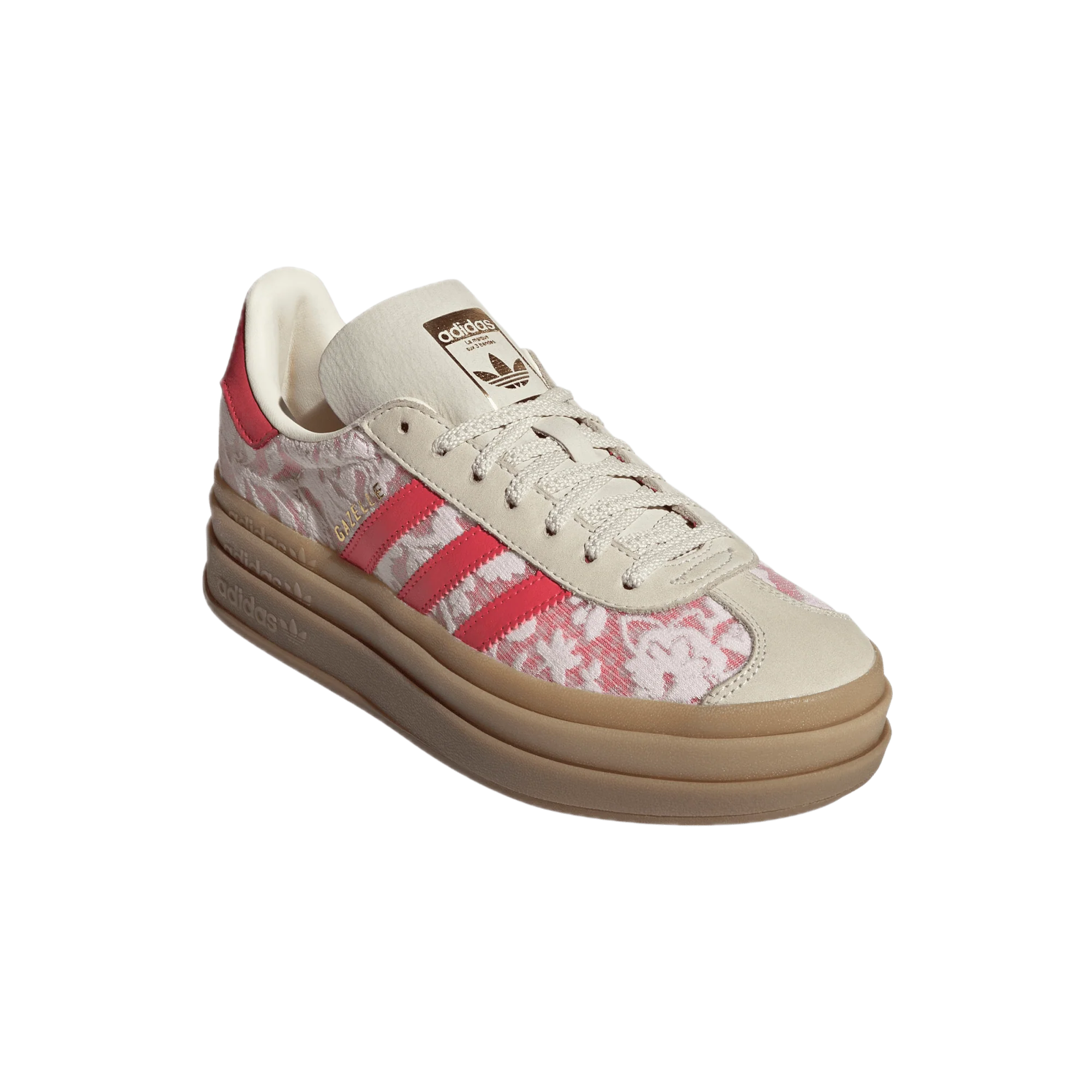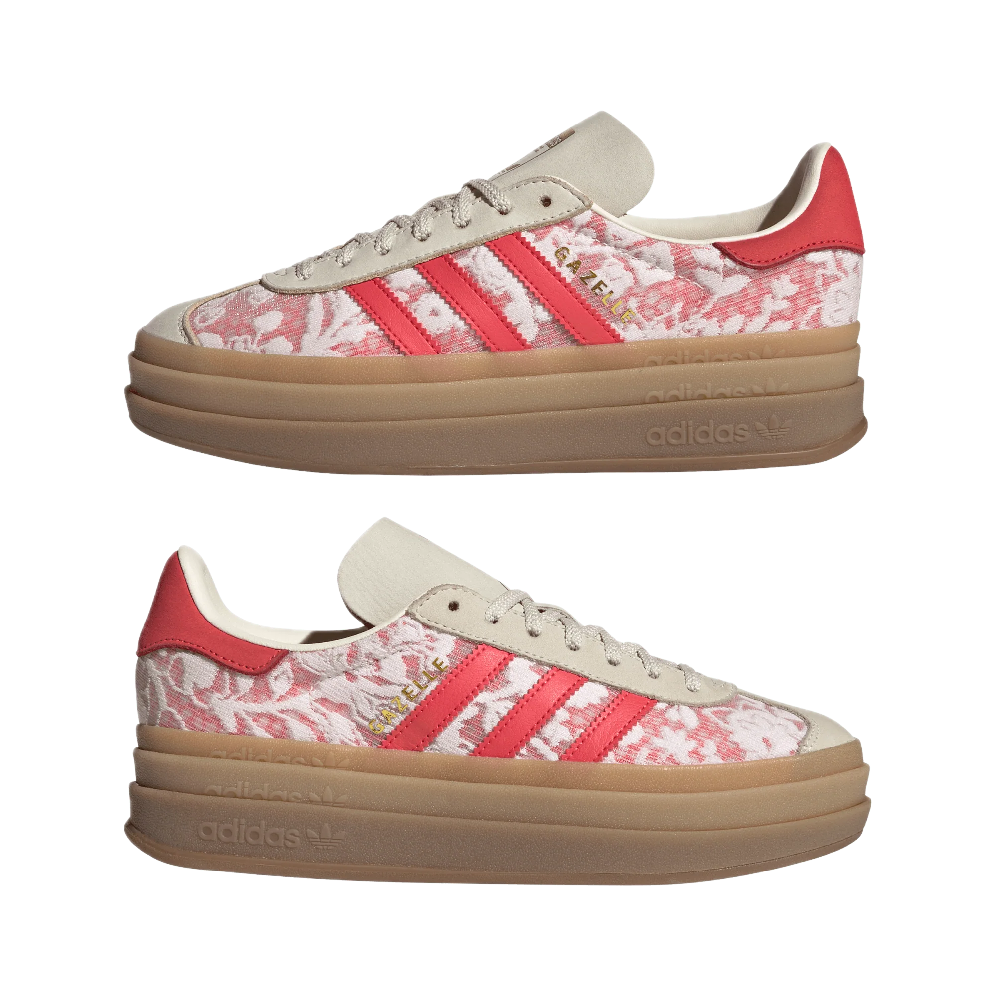 Model vyniká intenzivní barevnou kombinací Better Scarlet, doplněnou ikonickým květinovým motivem Liberty London. Vrstvená podrážka Bold zdůrazňuje moderní charakter boty, zatímco klasické detaily adidas si zachovávají rozpoznatelnou DNA modelu Gazelle.