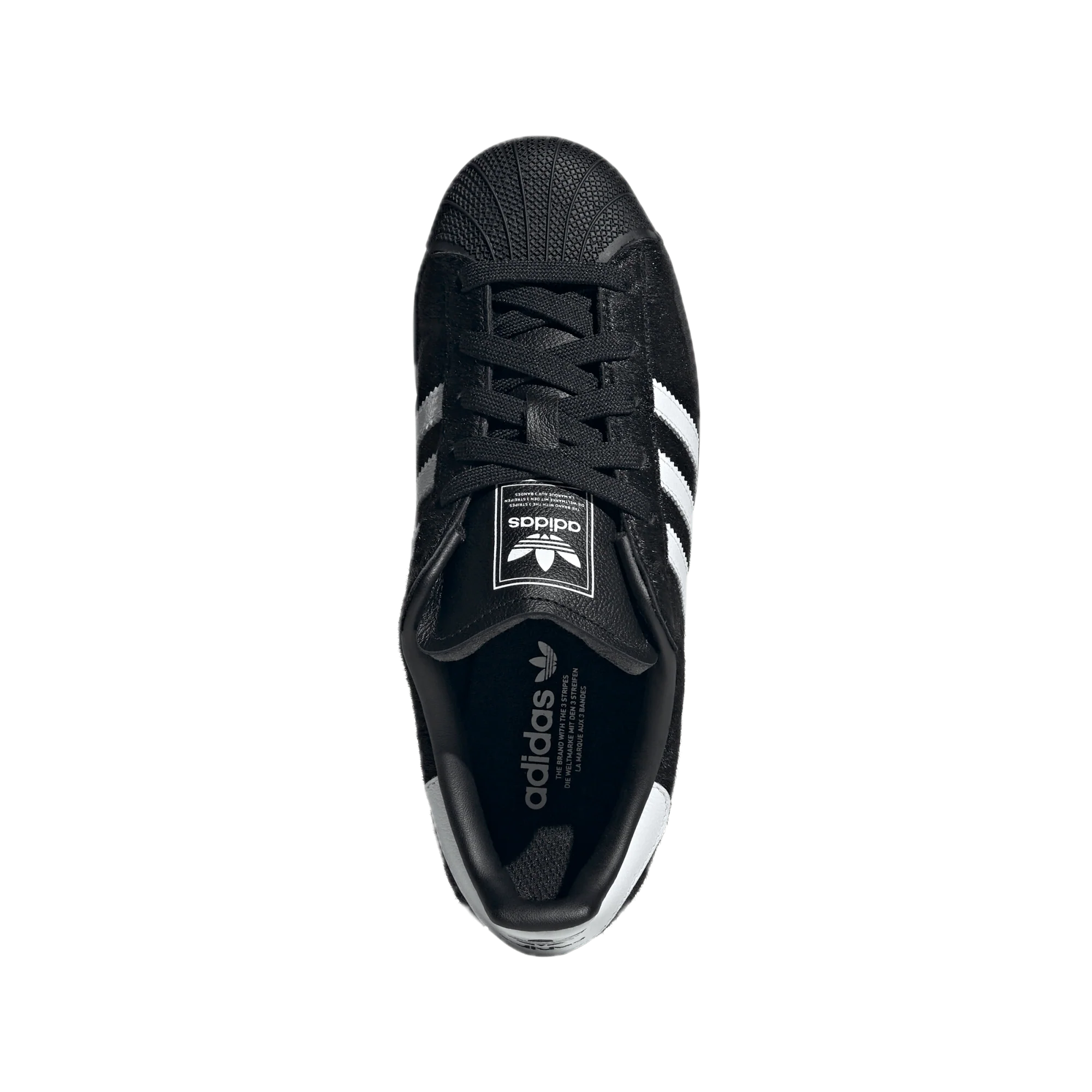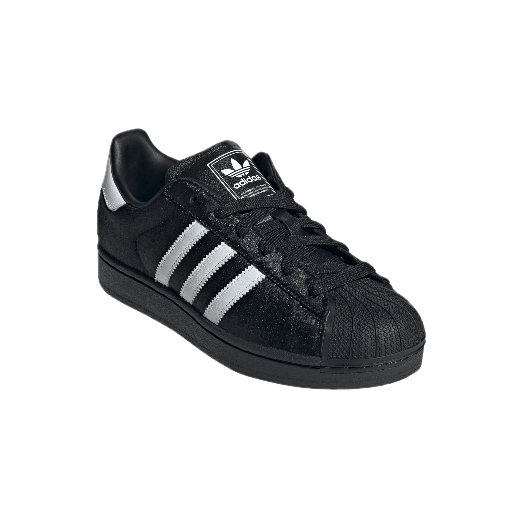 Tmavě černá barva v kombinaci s povrchovou úpravou z ponyhair dodává botám luxusní a módní vzhled. Charakteristická gumová špička a tři pruhy adidas zdůrazňují ikonickou DNA Superstar.