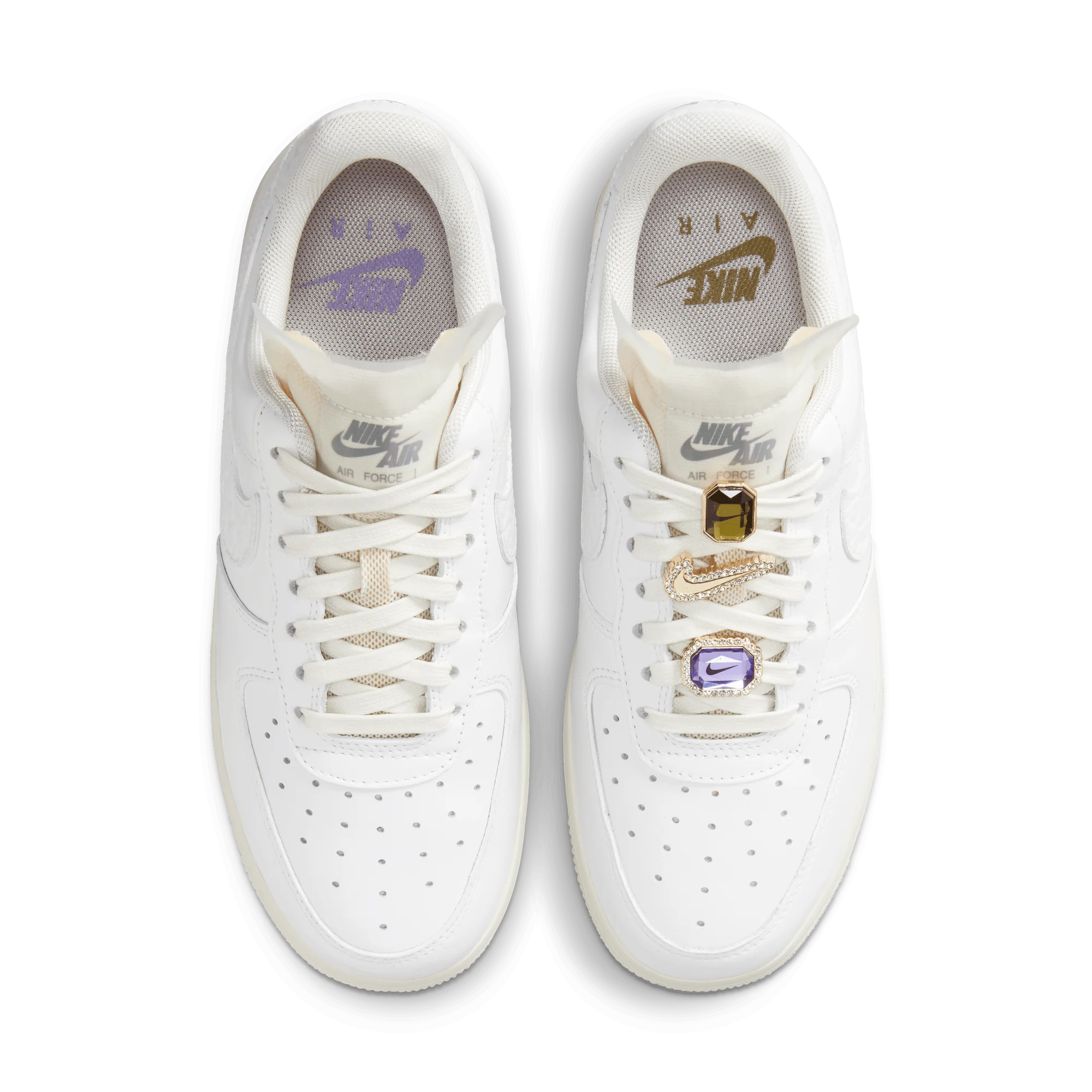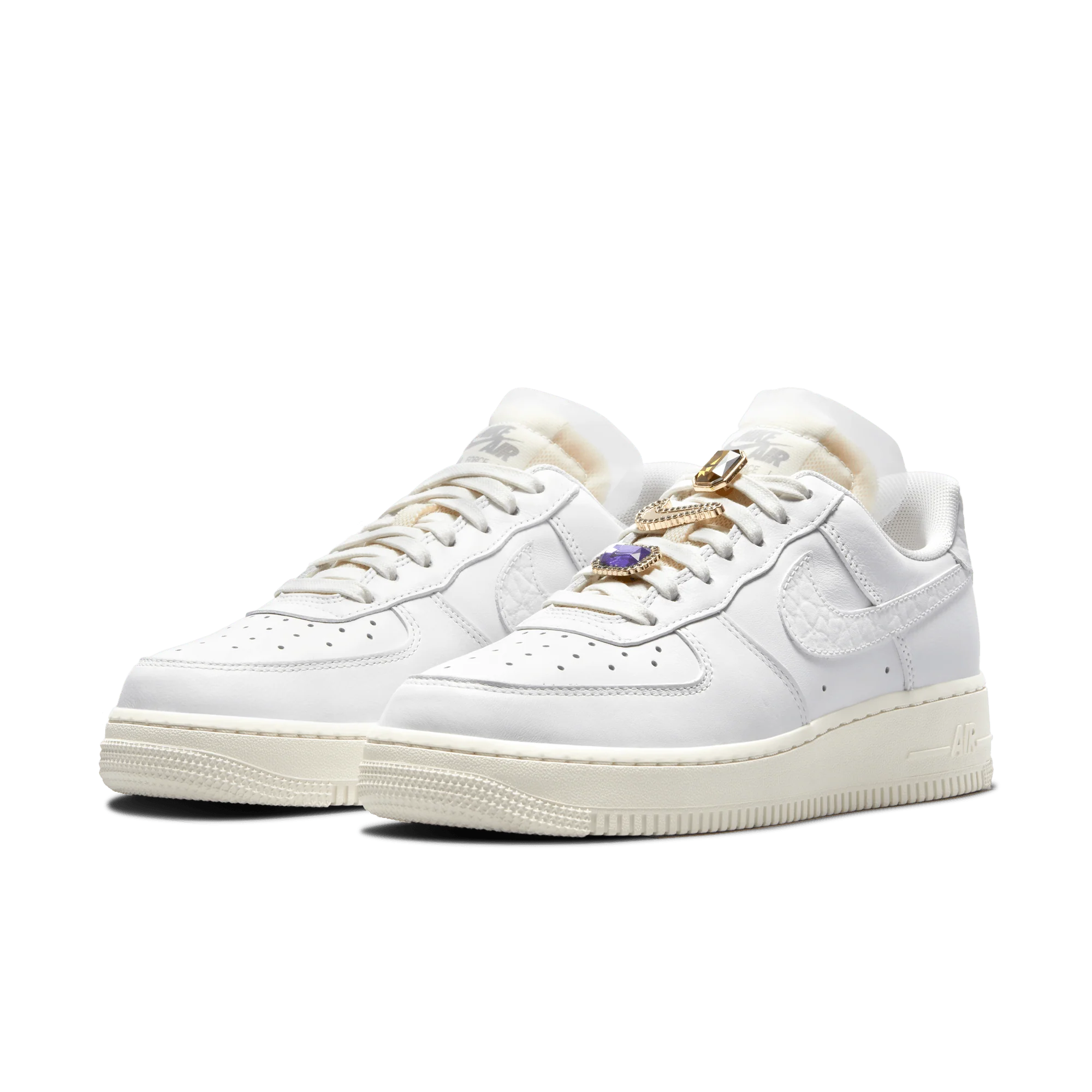 Tenisky se vyznačují čistým bílým barevným schématem, které zdůrazňuje jejich nadčasový vzhled. Největším rozlišovacím prvkem modelu jsou zdobené prvky Swoosh připomínající drahokamy, které přitahují pozornost a dodávají botám exkluzivní vzhled, aniž by obětovaly klasickou DNA Air Force 1.