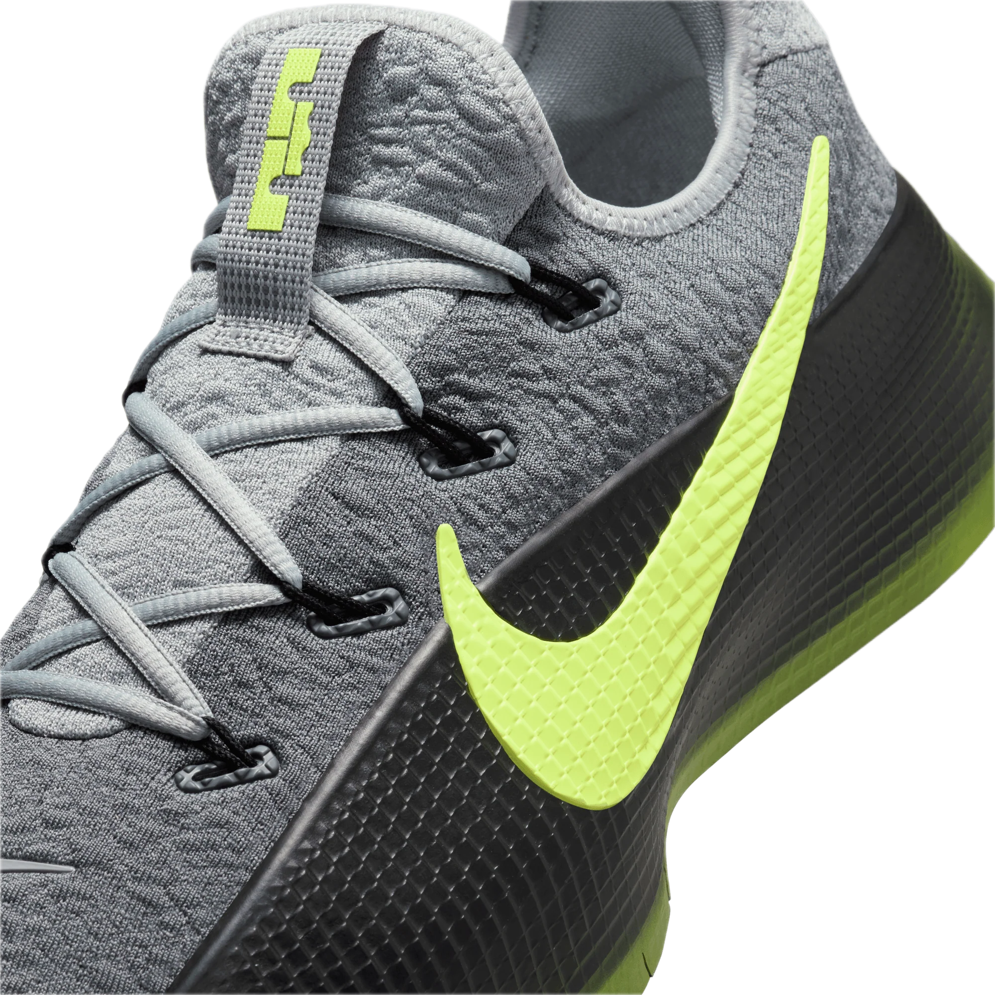 Tlumený kouřově šedý podklad je prolomen neonovými voltovými akcenty, které vytvářejí moderní, sportovní vzhled. Agresivní silueta, technické panely a charakteristické detaily LeBron zdůrazňují výkonnostní charakter modelu.