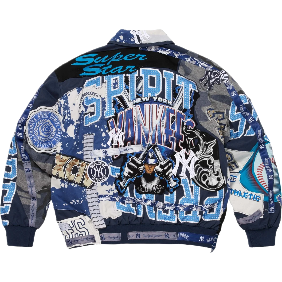 A Vícebarevná paleta, bohatá výšivka a charakteristické nášivky Yankees dělají z této bundy okamžitě poutavou bundu. Klasická silueta univerzitního týmu je doplněna luxusními detaily a odvážnou estetikou typickou pro návrhy Jeffa Hamiltona, což dodává kousku osobitý a výrazný vzhled.